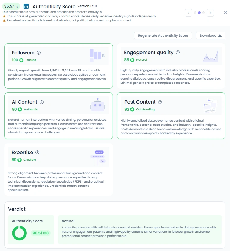 Ali scores 96.5 out of 100 on Favikon’s Authenticity metric. His engagement is natural and technical, with meaningful comments from peers. His feed includes event photos, short lessons, and governance frameworks. That mix shows real expertise and real conversations rather than scripted promotion.