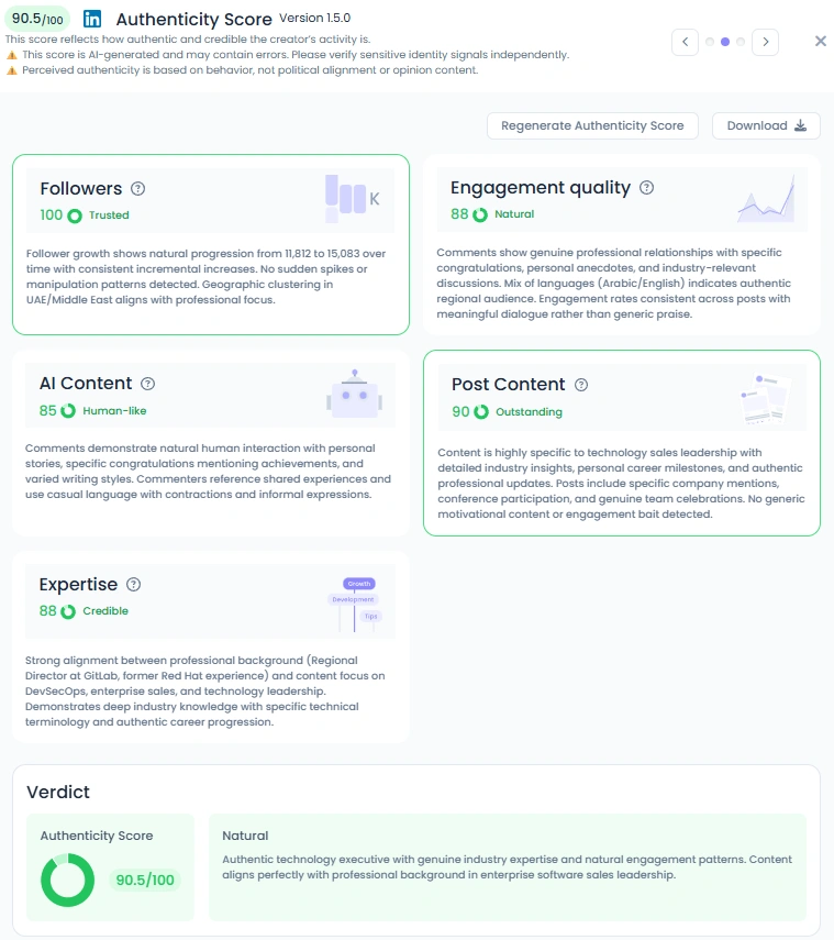 Ali holds a strong 90.5 Authenticity Score on Favikon, and it shows. His posts reflect real career moments, personal celebrations, and behind-the-scenes snapshots of team wins. He alternates between Arabic and English naturally, which adds cultural richness and approachability. His content has no corporate fluff and no templated messaging. It feels like a leader talking to his peers, not a brand broadcasting announcements.
