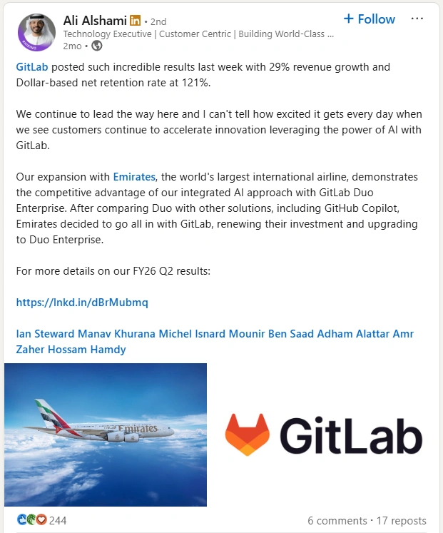 Ali operates in a high-trust, high-impact network spanning giants like GitLab, AWS, Emirates, Gartner, Boyner, and several UAE governmental and educational institutions. His circle includes decision-makers, founders, CTOs, and regional technology leaders. These relationships highlight both credibility and reach, showing how strongly Ali is embedded in the UAE’s digital and innovation community.