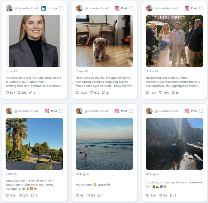 Alice communicates with clarity and warmth. She shares concrete updates about product launches, board work, and travel, and pairs them with candid moments that feel personal and relatable. Her content balances professional insight with approachable storytelling, which attracts brand teams, creators, and consumers who care about both craft and commerce.