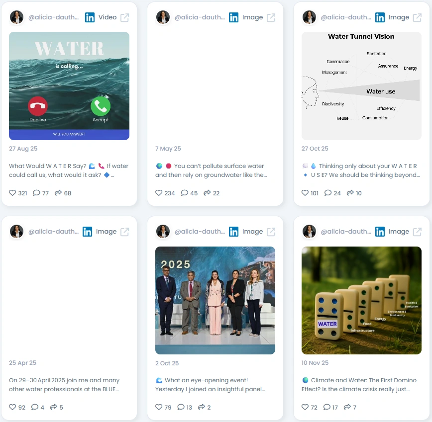 People listen to Alicia because she knows how to explain water issues without overwhelming the audience. Her tone is calm but urgent. She uses analogies, frameworks, and visuals that make technical topics easy to follow. Her posts spark meaningful debate and curiosity. She invites people into the conversation rather than lecturing from a distance.