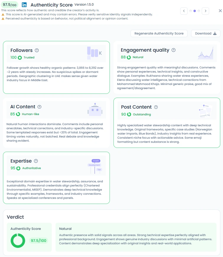 Alicia has grown from around 3.8K to nearly 8.4K followers over two years, all through organic engagement. Her Influence Score sits at 7 with 4,841 points, supported by high-quality discussions with professionals in the water, energy, and sustainability sectors. Engagement quality is strong, with meaningful comments and technical exchanges making up most interactions. She posts consistently through the year, especially around major industry events.