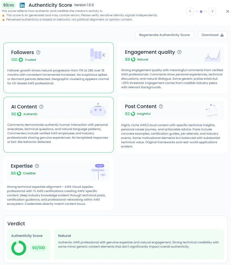 Favikon rates her authenticity at 93 out of 100. Signals look real and steady, from trusted follower growth to natural comment threads. You see selfies at events, badge moments, and honest reflections on progress. It feels like a friend who happens to ship cloud apps for a living.