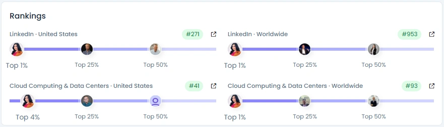 Aliya reaches about 28.8k followers on LinkedIn with growth around +8.53%. She posts roughly 14 times per month and engagement quality is good. Her Influence Score is 6,993 points, with strong rankings in Cloud Computing and Data Centers in the United States (#41) and worldwide (#93). Activity and positivity stay high while brand safety remains very safe.
