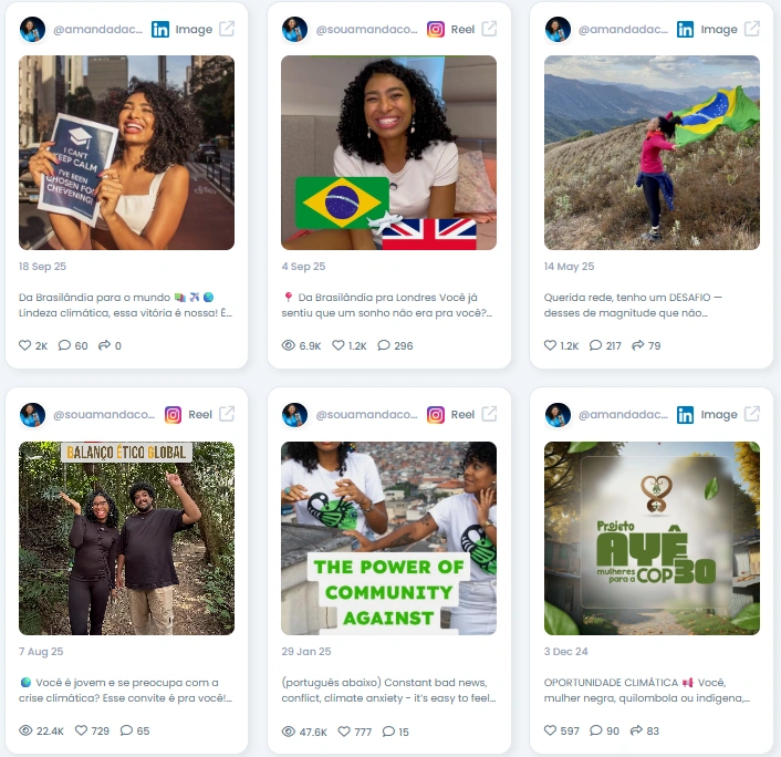 She connects with NGOs, academic institutions, media outlets, and youth networks. Her profile shows ties to international programs, award platforms, and major Brazilian organizations. That network amplifies campaigns and turns local initiatives into national conversations.