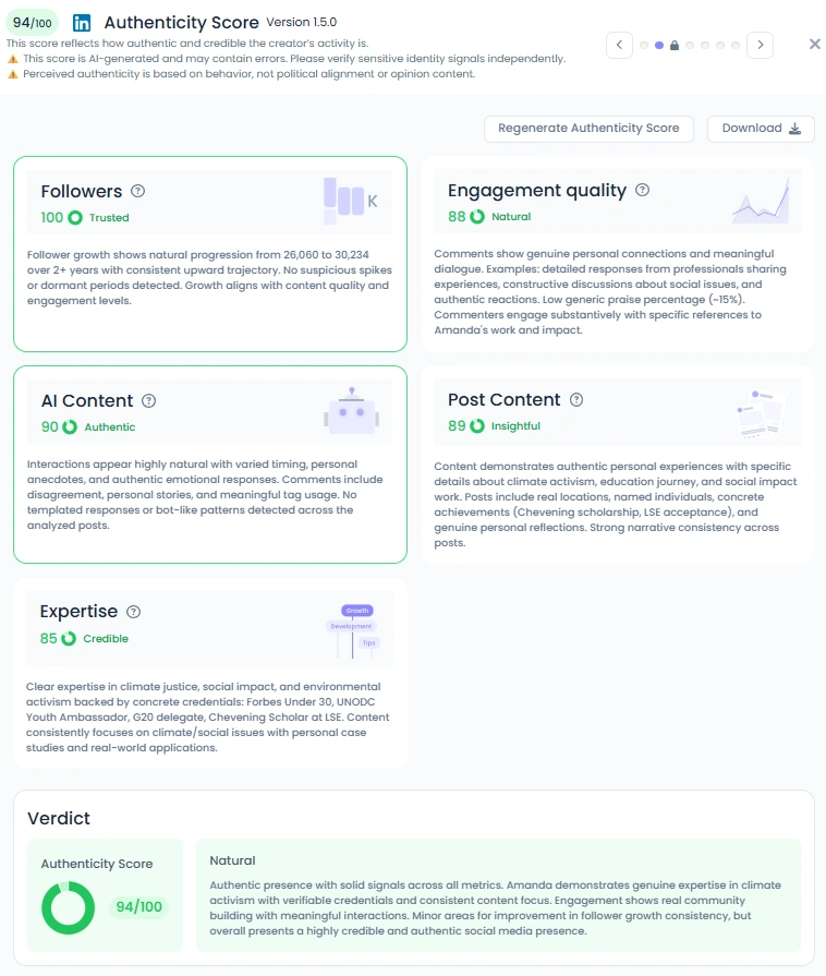 Favikon scores her authenticity highly. Her feed blends reels, candid photos, and long form reflections. Comments show real conversations with community members and sector peers. That mix of polished achievements and behind the scenes moments makes her voice trustworthy.