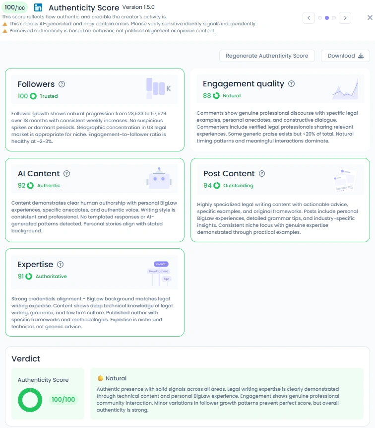 Favikon rates her authenticity at 100/100. Growth patterns are steady and clean. Comments read like real legal pros trading examples and asking for nuance. Personal anecdotes and practical checklists keep authority human.