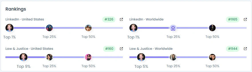 Amanda reaches about 57.6K followers on LinkedIn with good engagement quality. She posts roughly 9 times per month and grows at around +1.26%. Her Influence Score stands at 7,564 points at Level 4. Rankings place her in the top 1% on LinkedIn in the United States and top 9% in Law & Justice in the US.
