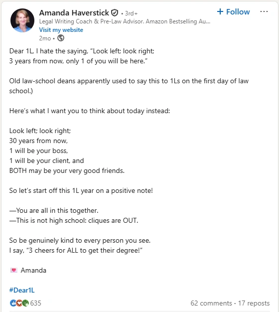 Amanda Haverstick teaches lawyers to write like people. Her posts are short, specific, and a little cheeky when a rule needs fixing. She gives 1Ls confidence and seasoned attorneys a tune-up. You leave her feed with a tool you can use today.