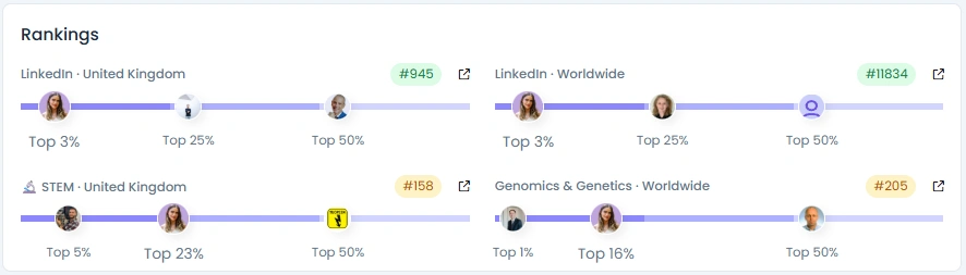 With more than 42,000 followers on LinkedIn and an Influence Score of 4,629 points, Amber ranks among the top 3 percent of creators in the UK. She also stands in the top 5 percent in STEM and the top 1 percent in Genomics and Genetics worldwide. Her engagement rate consistently scores above industry average, supported by an 88 out of 100 engagement quality and steady follower growth over six years.