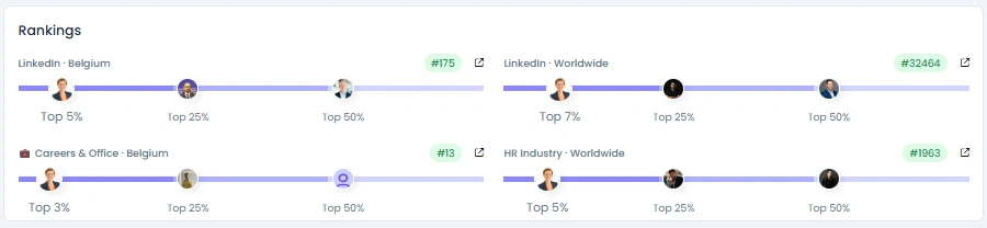 Followers grew from 30,177 to 30,858 with a smooth curve. Influence Score: 5,609 pts. Rankings place her #175 on LinkedIn Belgium and Top 5% in the HR Industry worldwide (#1,963), with #13 in Careers & Office Belgium and #32,464 worldwide on LinkedIn. Engagement quality is solid, driven by peers who add case studies, questions, and hiring wins.