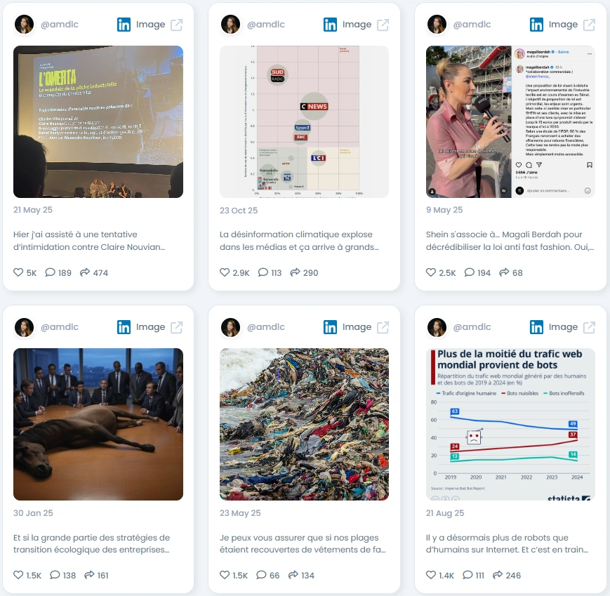 Amélie has built an audience of over 29,000 followers on LinkedIn through steady and organic growth. Her Influence Score of 7,403 points places her in the top 1% of LinkedIn creators in France and among the top 3% worldwide in Climate Activism and Entrepreneurship. Her engagement rate consistently surpasses 1%, with posts often gathering thousands of impressions and hundreds of interactions. Her visuals, backed by solid research, consistently spark public discussion around climate misinformation, fast fashion, and the ecological transition.
