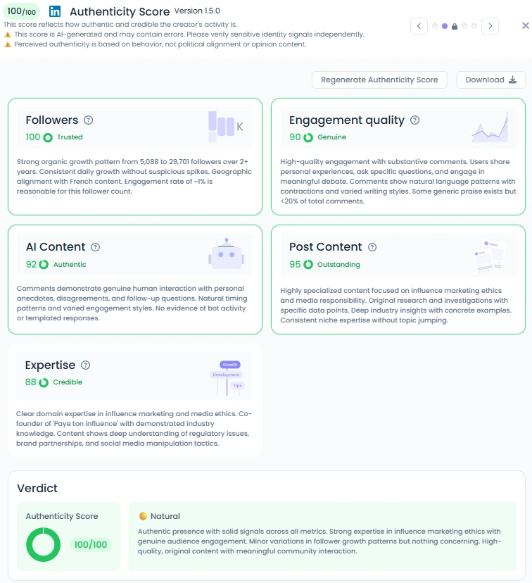 With a perfect Favikon Authenticity Score of 100/100, Amélie leads by example. Every post feels genuine, with organic discussions and informed debates in the comments. Her audience includes activists, journalists, and sustainability professionals who engage thoughtfully with her ideas. There are no signs of automation or generic content; only authentic insight grounded in expertise. Her transparency about influence ethics and environmental advocacy proves that authenticity isn’t a strategy for her; it’s a value.