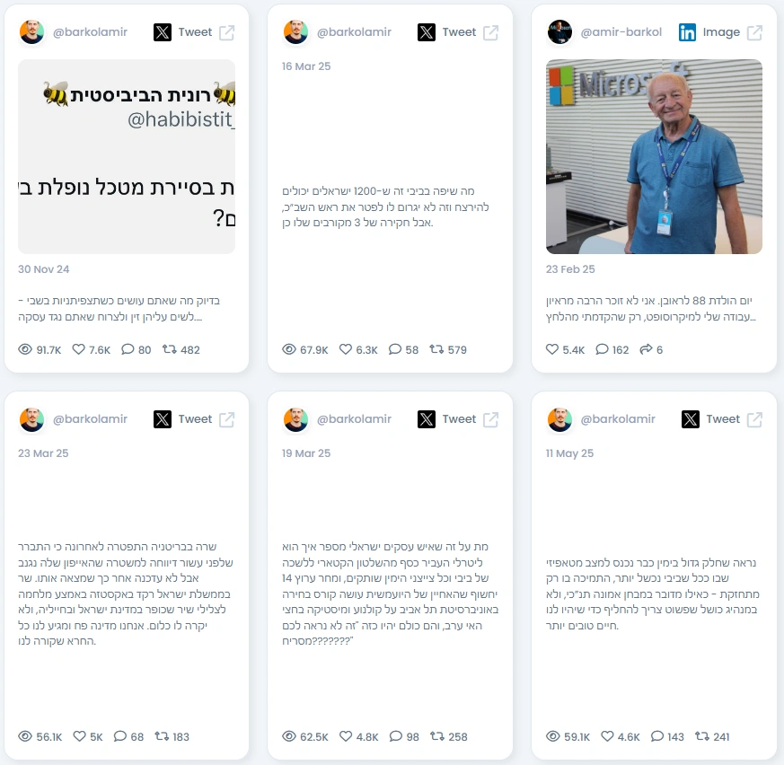 Amir’s follower count has grown from roughly 20K to more than 28K in just one year, with a natural upward trend and no artificial spikes. His Influence Score sits at 7,893 points, placing him in the top 1 percent of creators in Israel across LinkedIn and X. His engagement rate remains strong, with many posts surpassing tens of thousands of views and generating meaningful conversation. His posting rhythm is consistent and supported by high quality interactions.