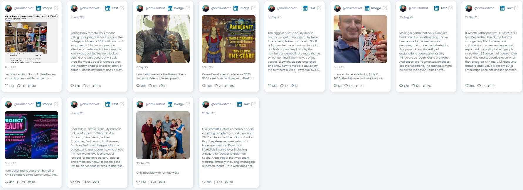 Amir consistently backs female empowerment, diversity and inclusion at work, and tech for good. He gives underserved talent a front row seat through giveaways, mentorship loops, and callouts that boost visibility. His posts argue for respectful debate and better workplace norms. The theme is access: more voices, more pathways, more dignity in how we build games.