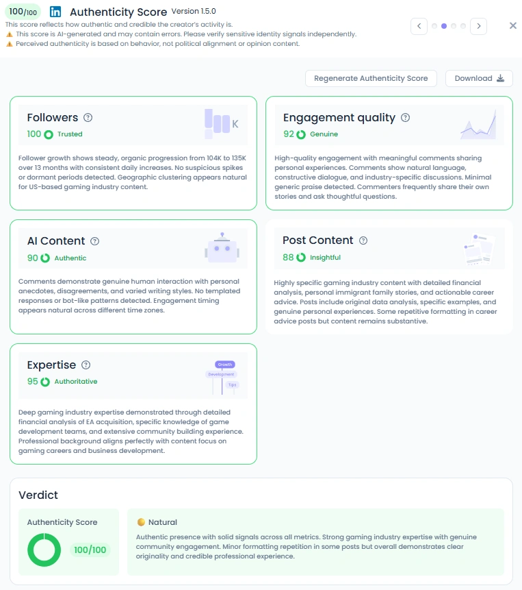 Favikon gives Amir a 100/100 Authenticity Score. Engagement quality is 92 (Genuine) with comments sharing personal stories and hard-won tips. AI Content reads 90 (Authentic) and Post Content 88 (Insightful). You’ll see family snapshots, award moments, and hands-on community projects alongside analysis — a balance of heart and evidence.