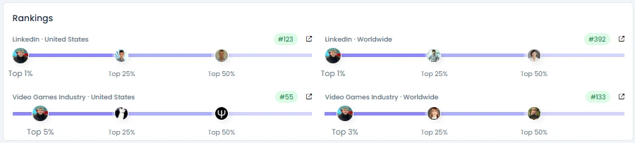 Influence Score sits at 8,236 pts. Followers climbed from 104K to 135K in 13 months with clean, organic curves. He ranks Top 1% on LinkedIn in the U.S. (#123) and Top 5% in the U.S. games industry (#55), with Top 3% worldwide in the category (#133). Posting rhythm is steady, and discussions are constructive with minimal generic praise.