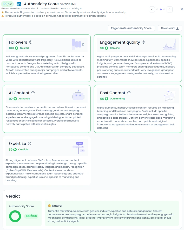 Andre holds a perfect 100 out of 100 Authenticity Score, which shows how real his presence is. His posts highlight team wins, share behind the scenes challenges, and celebrate achievements without exaggeration. Comments come from respected industry professionals who engage with meaningful questions and real life experience. No motivational fluff. No templated patterns. Just honest marketing content from someone who actually does the work.
