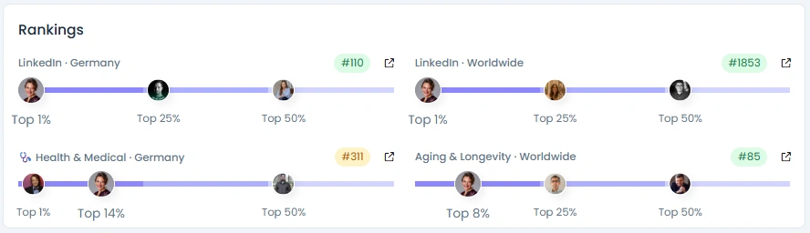 Andrea ranks in the Top 1% of LinkedIn creators in Germany with an Influence Score of 7,018 points. Her following grew organically from 22,700 to more than 32,000 professionals over the past three years. She is ranked among the Top 8% worldwide in Aging and Longevity, a reflection of her global impact on science communication. Her steady posting rhythm, high engagement, and authentic audience growth highlight her ability to transform academic work into accessible, high-impact storytelling.