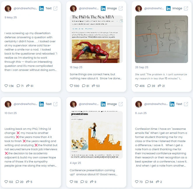 Favikon gives Andrew an Authenticity Score of 100/100. Comments come from verified academics swapping stories and tactics. Posts reference real workshops, student notes, and before–after examples. No engagement bait. Just useful, human coaching.