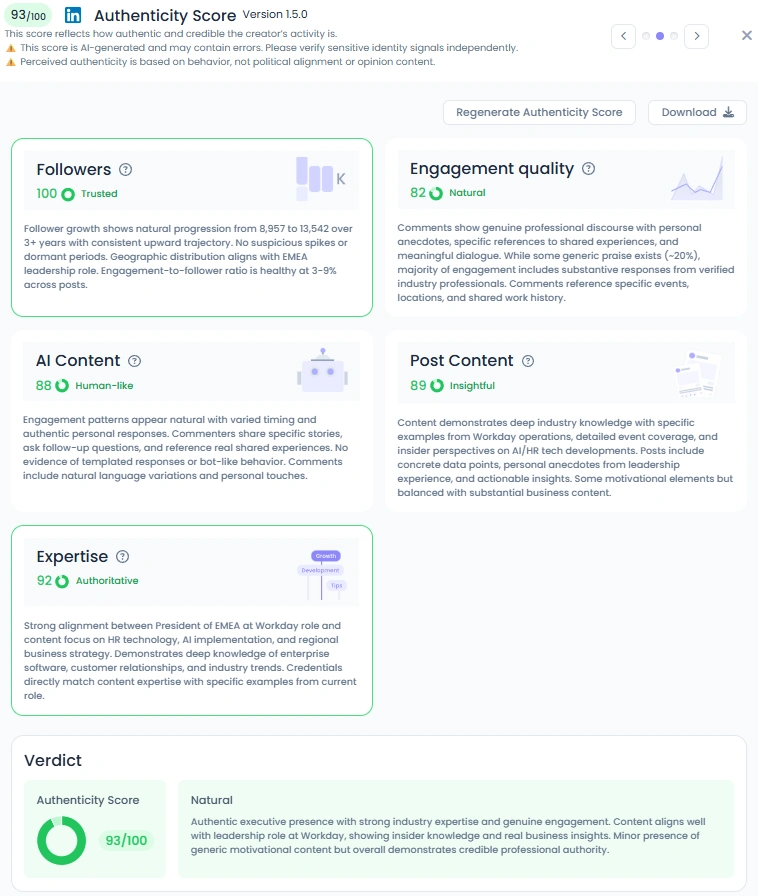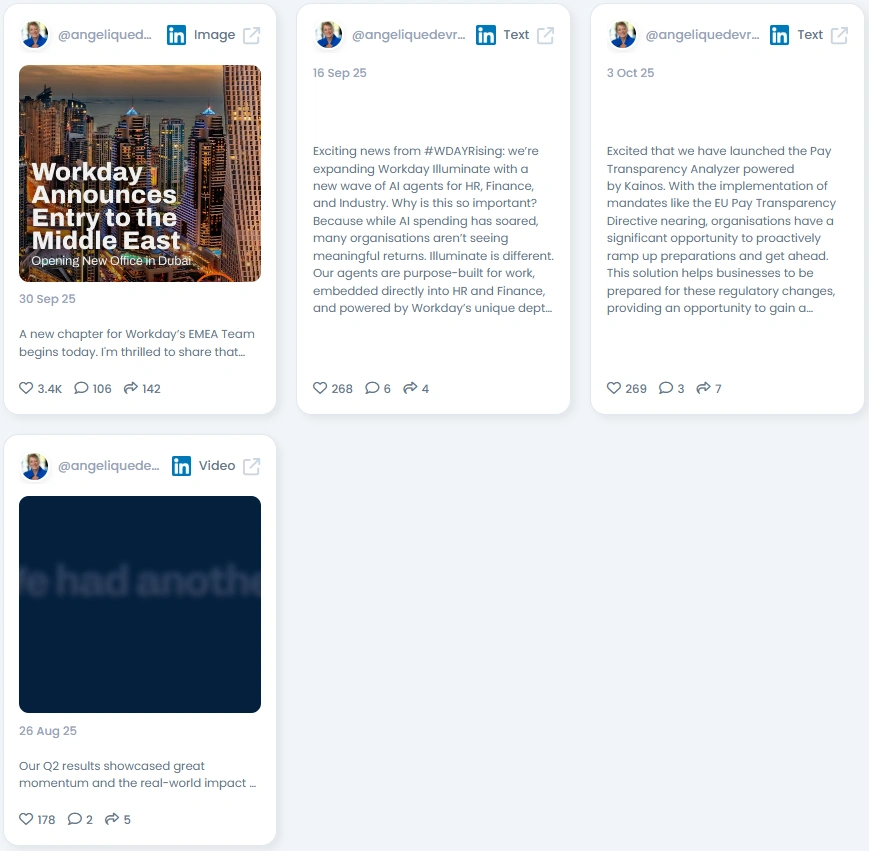 With an impressive Favikon Authenticity Score of 93/100, Angelique balances authority and approachability. Her follower growth is natural and steady, reflecting genuine community interest. Comments on her posts often include thoughtful engagement from verified professionals who share their own experiences. Whether celebrating Workday’s expansion into the Middle East or discussing the impact of AI in HR, her messages stay transparent and consistent. Angelique’s authenticity lies in her ability to make leadership feel relatable while maintaining depth and credibility.