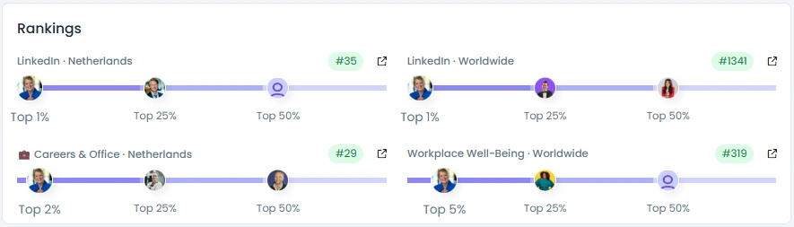 Angelique holds an Influence Score of 6,509 points, ranking in the Top 1% on LinkedIn in the Netherlands and among the Top 5% worldwide in Workplace Well-Being. Her follower base of over 13,000 professionals continues to grow steadily, with strong engagement averaging 3–9%. Her posts often generate hundreds of reactions and comments, proving that her audience values substance and sincerity over hype.