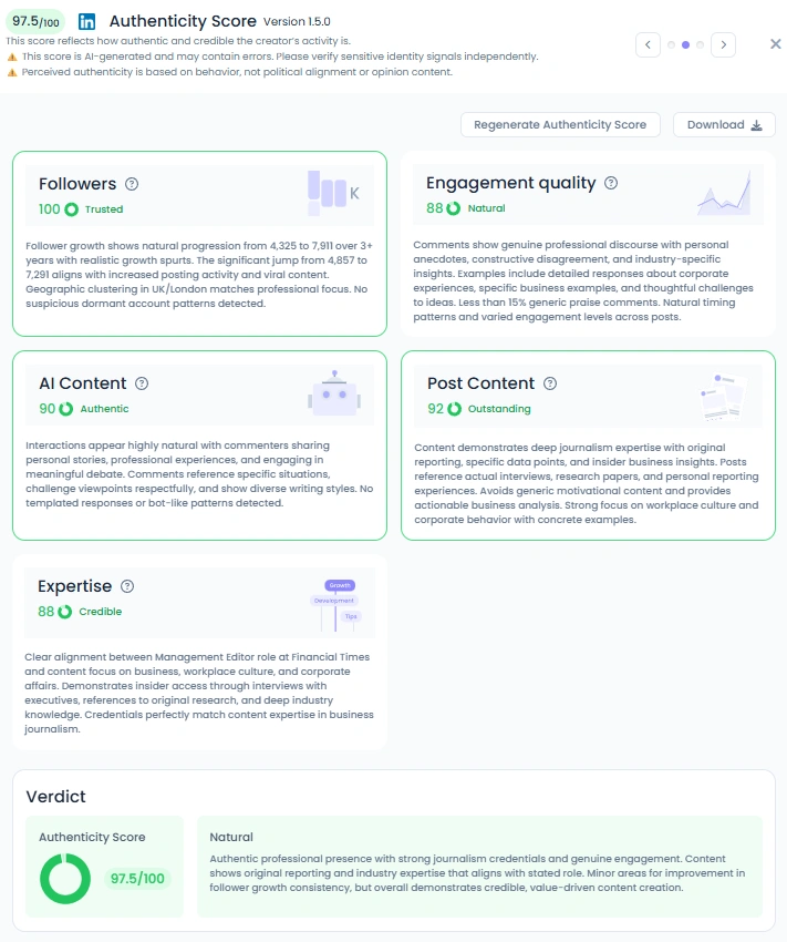Favikon scores her at 97.5/100 for authenticity. Her feed shows original reporting, thoughtful articles, and substantive discussion. Posts invite professional debate rather than empty praise. Commenters share specific views and sources, which signals real engagement. Her voice is earnest, expert, and consistent.