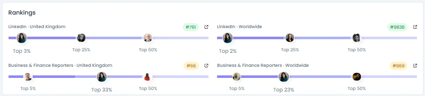 Anjli’s followers have grown from about 4.3k to 7.9k over three years, reflecting steady, topic-driven interest. Her engagement quality sits at 88/100, and her post content scores 92/100, showing strong resonance with a professional audience. Her Influence Score is around 4,197 points, and she ranks highly among business and finance reporters in the UK and globally.