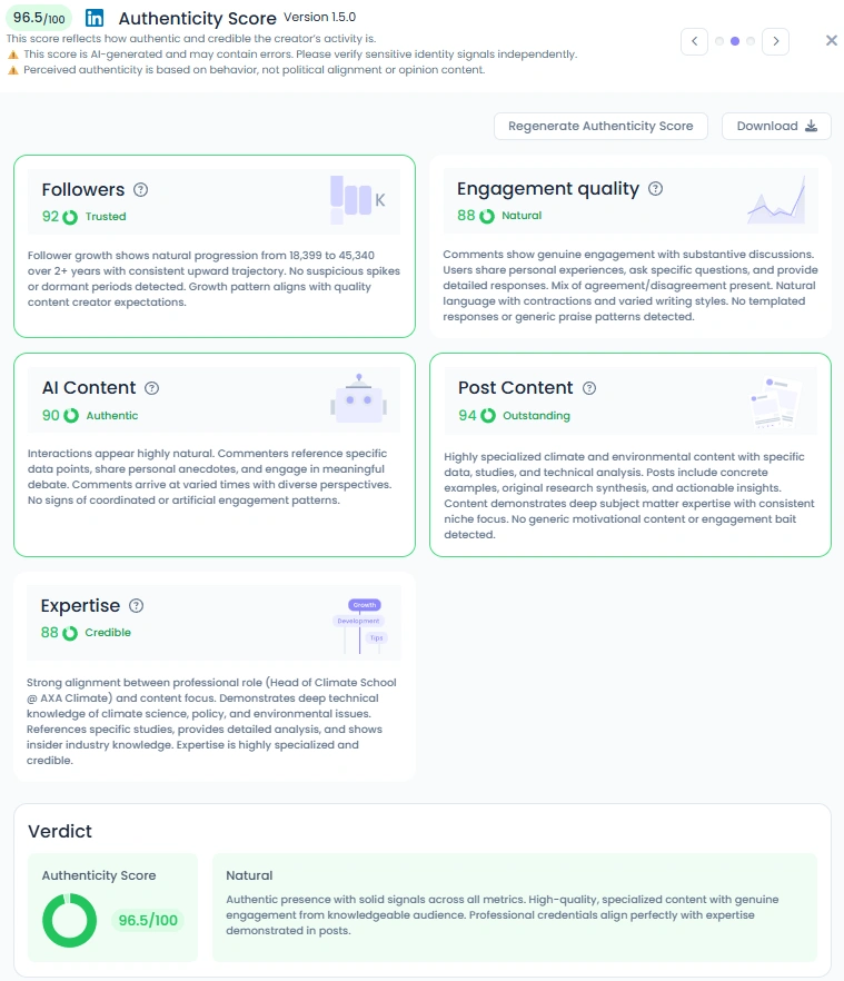 With a Favikon Authenticity Score of 96.5/100, Antoine’s credibility is as strong as his message. His engagement reflects genuine debate, thoughtful disagreement, and expert exchange. Commenters include researchers, entrepreneurs, and climate professionals who challenge and enrich his content rather than simply agree with it. This natural mix of discussion and insight proves that Antoine’s influence comes from trust and transparency, not performance.