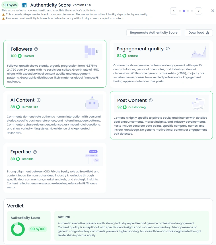 With a Favikon Authenticity Score of 90.5/100, Anuj demonstrates genuine executive presence online. His content mixes high-level finance with relatable reflections on teamwork, global travel, and leadership lessons. Comments on his posts show engagement from peers, analysts, and industry executives through thoughtful exchanges that go beyond surface-level praise. His consistency and tone make him a trusted voice in private equity circles.