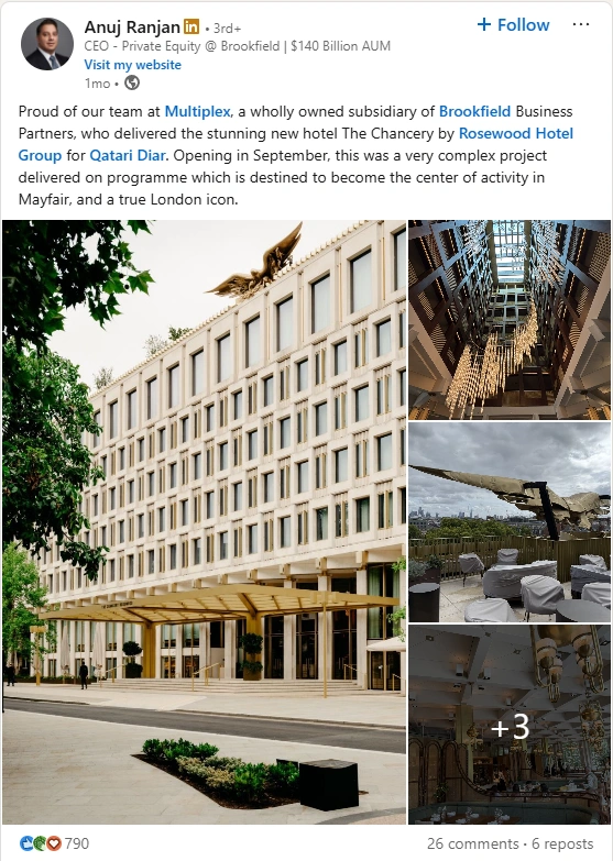 People follow Anuj because his insights come from real boardroom experience, not just theory. His communication style is sharp and measured, often highlighting deal milestones, team achievements, or new market entries. Each post gives a peek into how Brookfield approaches growth, which is grounded, strategic, and people-centered. It’s the kind of leadership that resonates with professionals who value both ambition and authenticity.
