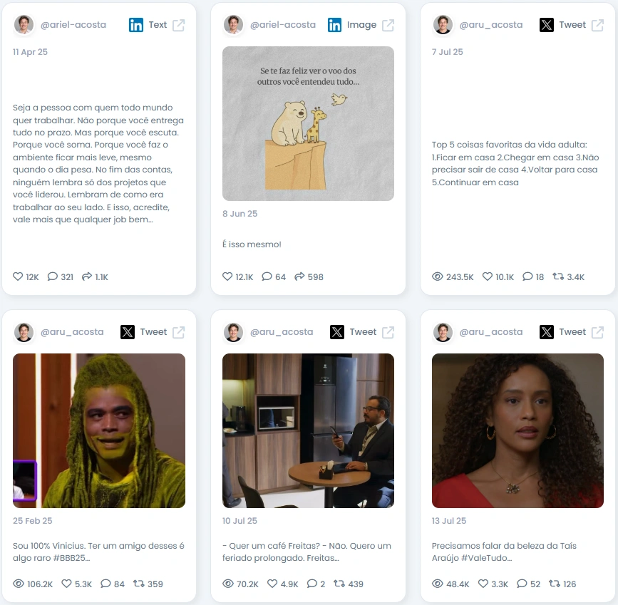 Ariel has grown from 14,497 to 17,010 followers in 11 months, thanks to steady content and active engagement. He holds an Influence Score of 7, 337 pts, ranking in the top 1 percent on LinkedIn in Brazil and top 3 percent in digital marketing. His LinkedIn posts consistently receive over 12K likes, while his tweets reach hundreds of thousands of views. He mixes formats with ease, from text-based leadership content to humorous cultural commentary on Twitter. His posting rhythm is natural but regular, building momentum without burnout.