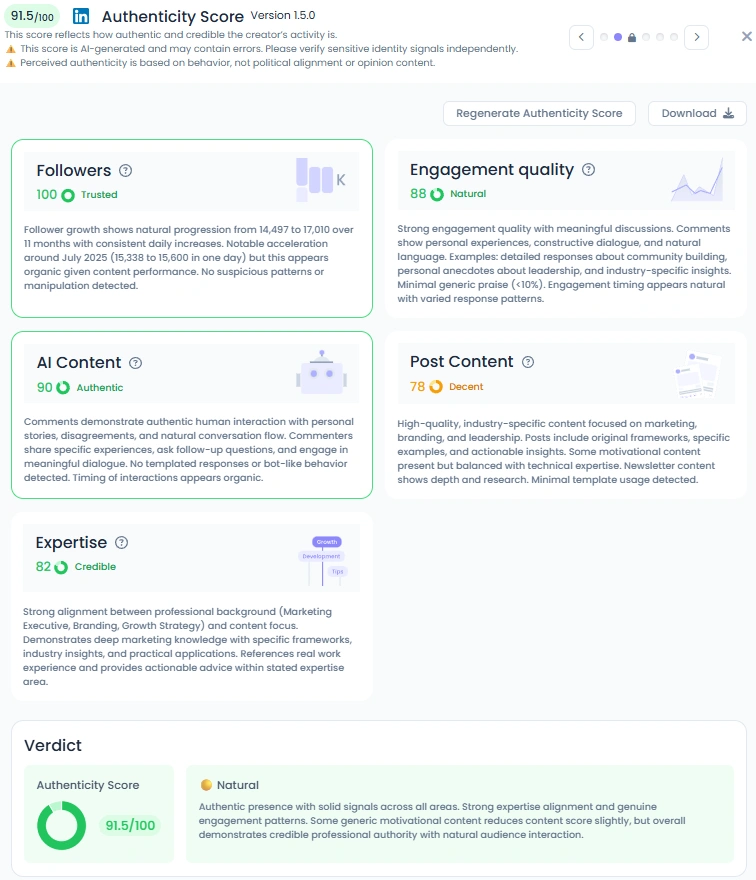 Ariel’s Favikon Authenticity Score is 91.5/100, one of the highest in his segment. His AI Content score of 90 and Engagement Quality of 88 point to genuine conversations, thoughtful replies, and an audience that engages with more than just emojis. His posts include specific examples, personal stories, and open questions that create real dialogue. Even when he shares on Twitter, the vibe stays grounded and honest. No filters, no fluff; just a creator who knows what he’s talking about and how to say it well.