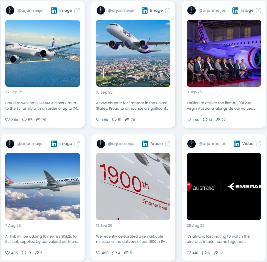 Arjan Meijer brings clarity, leadership, and passion to the global aviation conversation. As the President and CEO of Embraer Commercial Aviation, he’s a voice that represents the future of efficient, sustainable air travel. His posts combine business insight with optimism, showing how innovation and collaboration drive progress in the aviation world. Whether it’s celebrating a new aircraft delivery or strengthening industry partnerships, Arjan’s perspective always lifts the conversation to new heights.