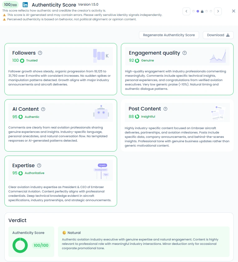 With a Favikon Authenticity Score of 100/100, Arjan’s online presence is as trustworthy as it gets. His follower growth, now surpassing 31K professionals, shows genuine engagement built around credibility, not promotion. His posts invite real conversations among aviation professionals, often including specific technical insights or words of congratulations from industry peers. He doesn’t rely on buzzwords or self-promotion; instead, his updates highlight teamwork, innovation, and progress across the industry.