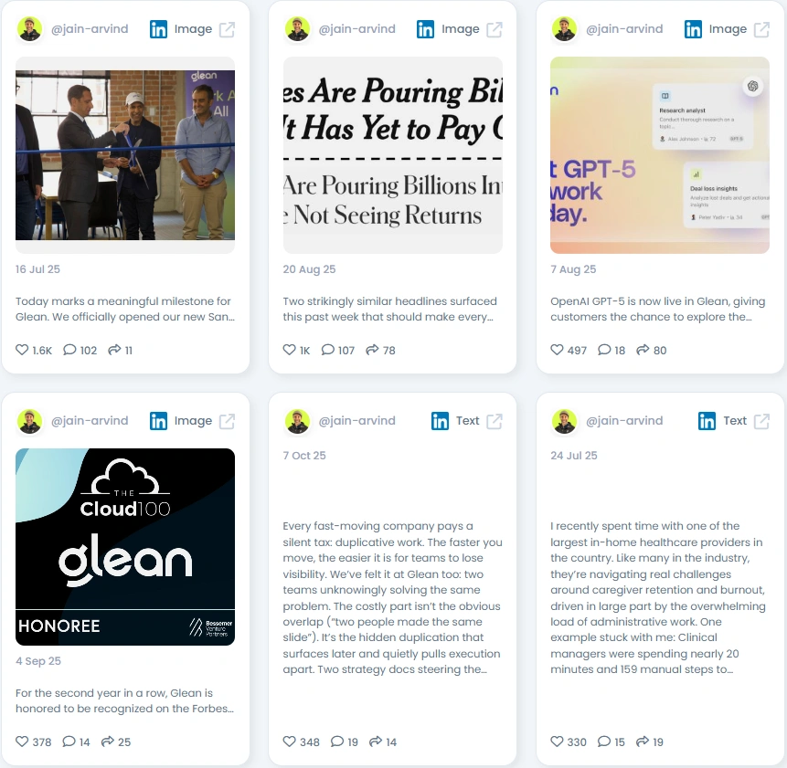 Arvind spotlights partnerships across the enterprise AI stack, from model providers and vector databases to customer IT teams. He amplifies Glean’s integrations and co-announcements with platforms like Databricks while celebrating customer wins in healthcare and services. He joins media features and conference stages to translate research into operations.