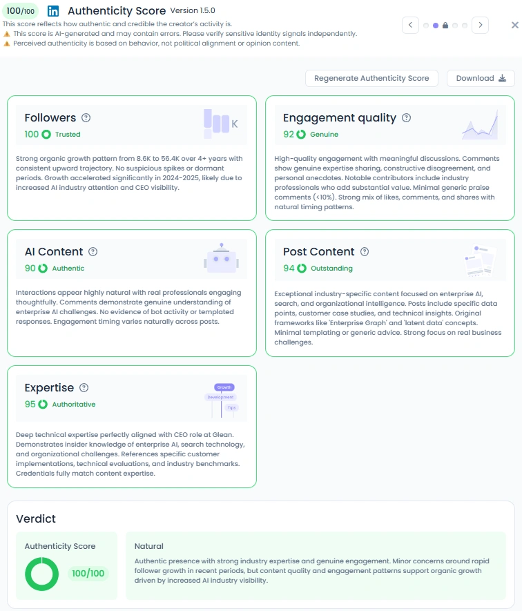 Favikon Authenticity Score: 100/100. Engagement features genuine debates with product leaders and data scientists. Content includes original frameworks such as the “enterprise graph” and “latent data” ideas, plus screenshots from rollouts and customer briefings. The tone is practical and human, not performative.
