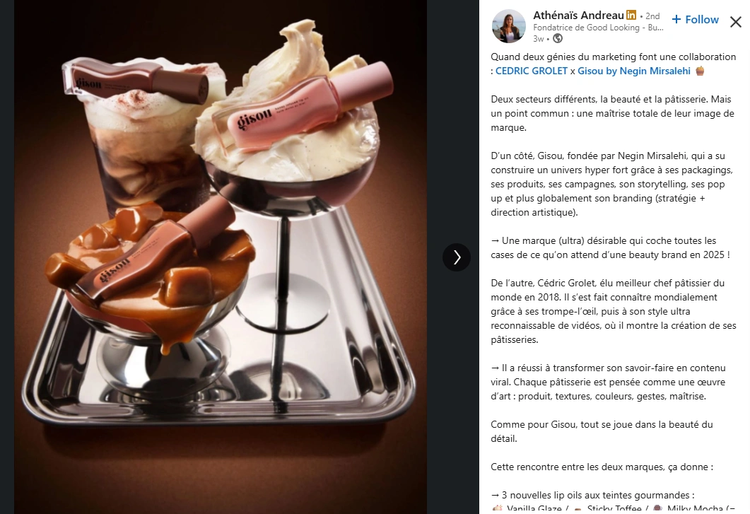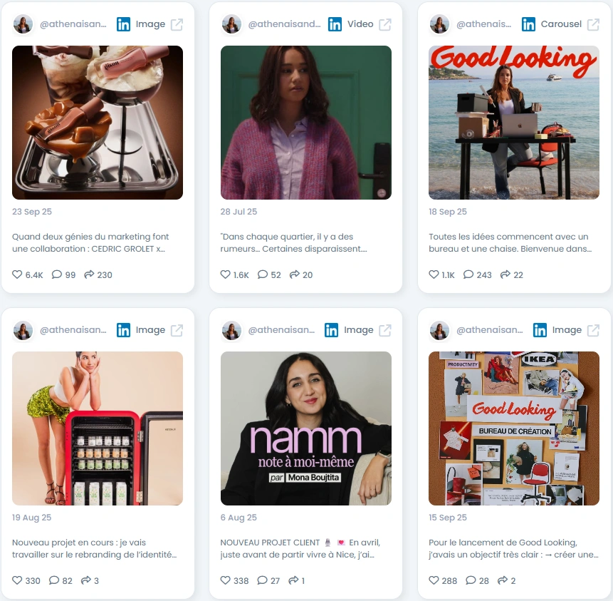 Athénaïs is an artistic director and personal branding consultant. She helps startups, creators, and executives build strong identities with smart content and design. Her portfolio spans fashion, beauty, lifestyle, and tech. She shares behind-the-scenes processes, moodboards, and client wins that show the work, not just the highlight reel. Recent posts include a Cédric Grolet collaboration reaction, a rebrand in progress, and the launch of her studio series Good Looking. She positions herself as the creative partner who brings strategy and aesthetics together.