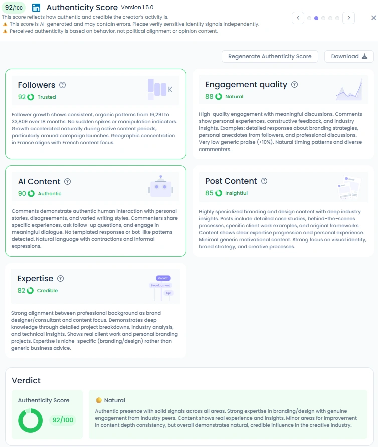Favikon rates her Authenticity Score at 92/100. Comments are real and specific, often from designers and clients who share their own takes. Her content earns Engagement Quality 88, AI Content 90, and Post Content 85. The vibe is candid and energetic, with stories from live projects and launches.