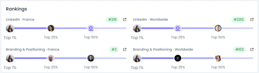 She reaches 34.9K on LinkedIn, with extra presence on TikTok and Instagram. Growth sits around +4.28%, with 12 posts per month and very good engagement. She ranks Top 1% on LinkedIn in France, #218 overall, and #3 in Branding and Positioning France (#103 worldwide). Her Favikon Influence Score is 4 with 7,532 pts.