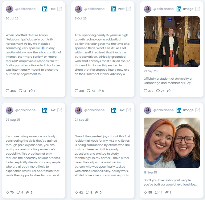 Aubrey is an equitable design advocate and DEI expert known for building policies that actually work. After 15 years in high-growth tech, they stepped into a Director of Ethical Advisory role while beginning graduate study in AI Ethics at the University of Cambridge. On LinkedIn, Aubrey shares frameworks on power, anti-harassment policy design, and hiring practices that do not penalize people for non-linear careers. They translate organizational psychology into everyday decisions managers can make. The positioning is clear: evidence first, people centered, accountability always.