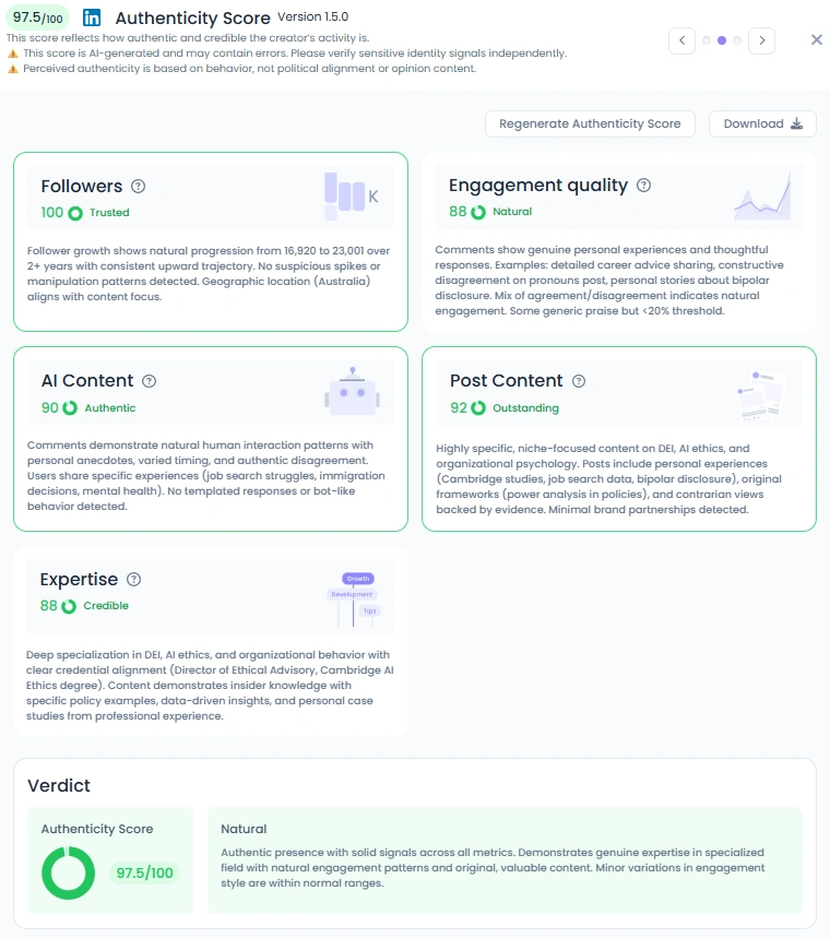 Favikon puts their Authenticity Score at 97.5 out of 100. Comments feature personal stories, pushback, and thoughtful nuance on topics like pronouns, job search bias, and mental health disclosure. Posts include classroom moments from Cambridge, policy drafts, and community snapshots. Minimal brand fluff, maximum value.