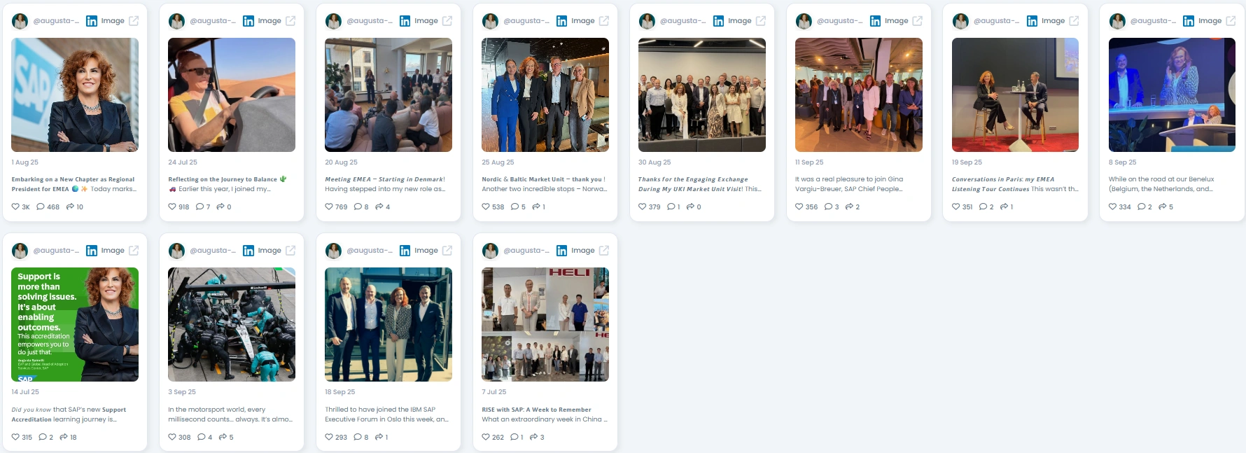 Augusta Spinelli has built a reputation as a leader who blends strategy with heart. She isn’t just driving SAP’s adoption forward, she’s making complex transformation stories relatable and inspiring. Her posts reflect a mix of boardroom gravitas and genuine human connection, which is why her voice carries weight across industries.