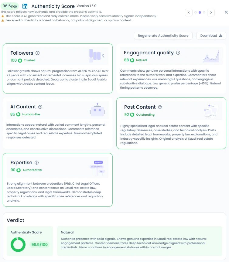 Bader scores 96.5 for authenticity, reflecting natural follower growth and high quality engagement. His posts combine official updates, meeting photos, and practical commentary. Audience responses are substantive, with peers asking pointed questions and sharing professional experiences. His presence feels consistent and genuinely informative.