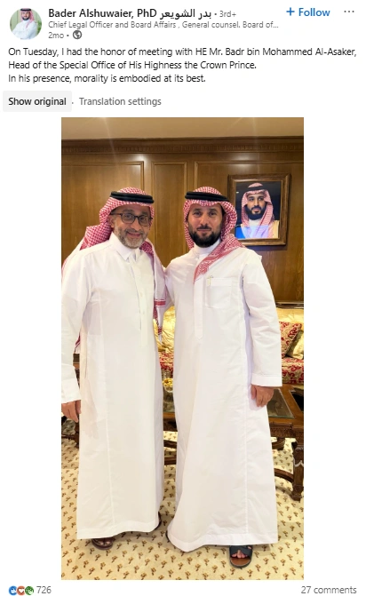 Bader’s network spans government bodies, senior officials, and legal institutions in Saudi Arabia. He is connected to ministry advisors, board-level executives, and professional peers who shape regulation and governance. That proximity to decision makers and institutions gives his commentary extra weight and access to up-to-date regulatory detail.