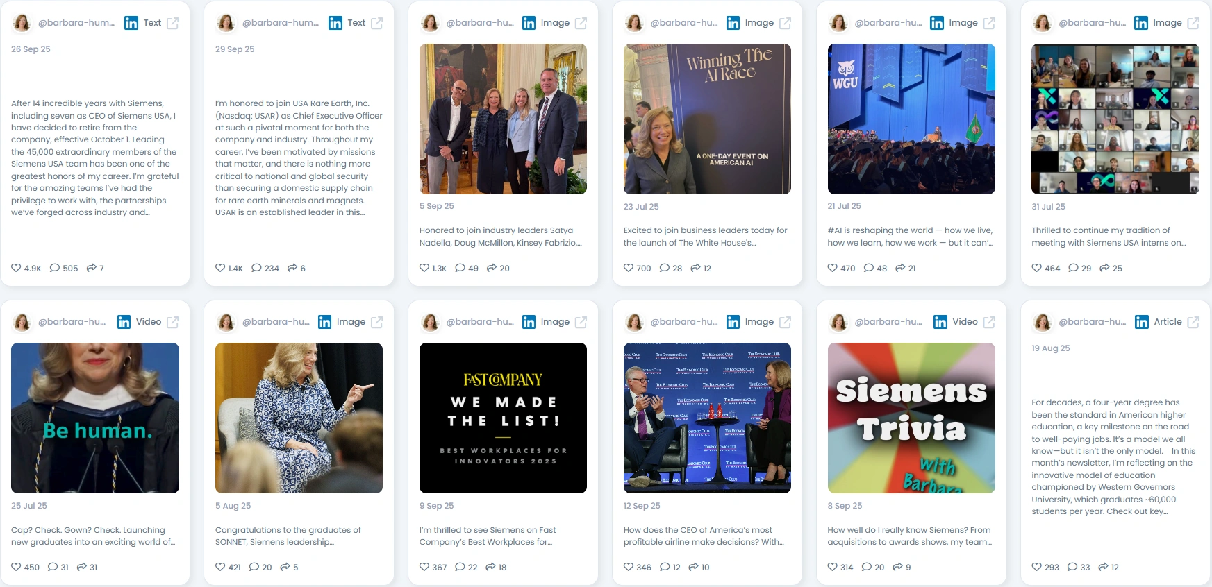 Barbara’s communication style blends authority with warmth. Her posts highlight not just policy or corporate wins but also her personal reflections, whether it’s honoring Siemens interns or celebrating graduates. She uses approachable language, making high-level strategy accessible to wide audiences. Her optimism, paired with genuine curiosity about people and ideas, makes her a leader others want to follow.