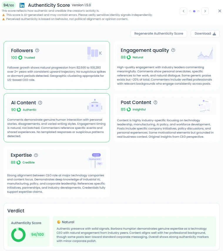 With an Favikon Authenticity Score of 94/100, Barbara demonstrates how to balance corporate leadership with personal storytelling. Her LinkedIn activity includes heartfelt tributes to colleagues, candid reflections on career transitions, and photos that capture human moments behind the titles. Engagement from industry peers feels natural and specific, reinforcing that her voice isn’t scripted but rooted in real connections.