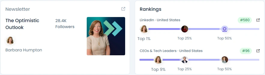 Barbara’s LinkedIn following has grown steadily from 82K to over 108K, with consistent engagement across her content. She holds an Influence Score of 8,130 points, ranking in the top 1% on LinkedIn in the U.S. and top 9% among CEOs and tech leaders. Her posts regularly attract hundreds to thousands of interactions, with comments coming from verified industry professionals. This strong engagement shows her influence is built on credibility rather than fleeting virality.