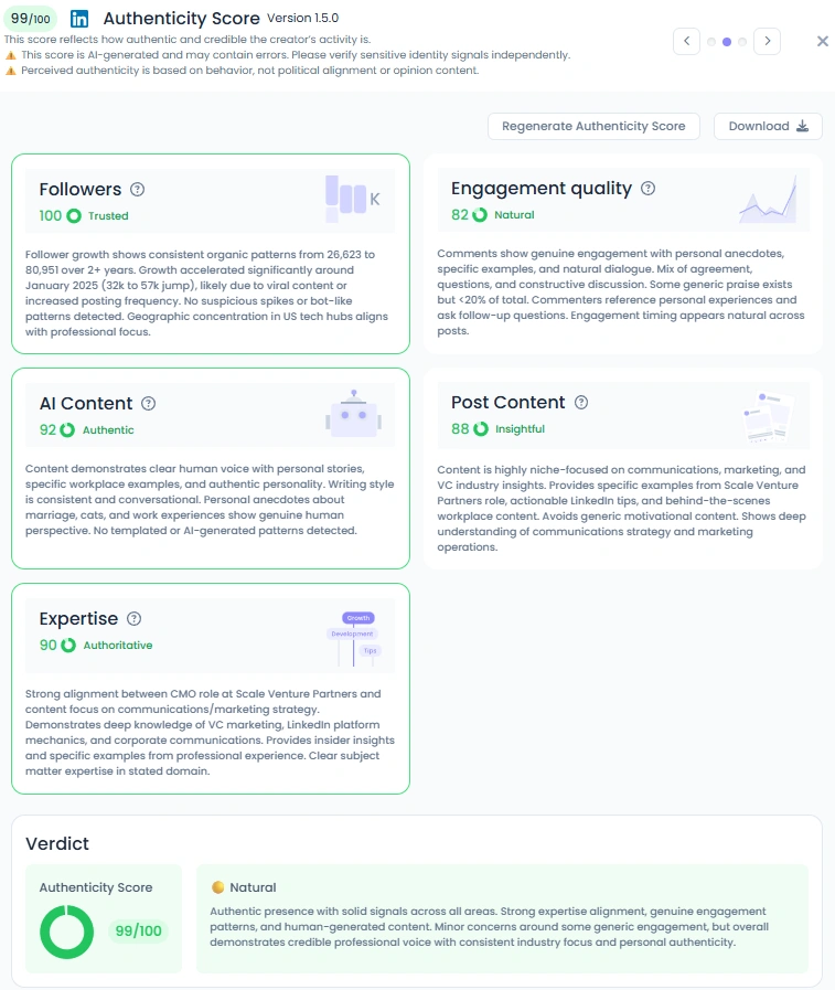 Favikon rates her authenticity at 99/100. Her feed mixes wins, lessons, parenting moments, and honest takes on layoffs and work. You will also see selfies and day to day shots that keep things approachable. Comments look natural with questions, debate, and first person stories. It feels like a smart friend who also runs the room.