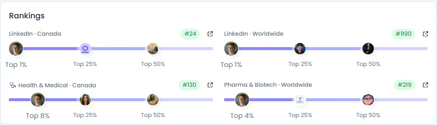 Benjamin reaches about 34.6K followers on LinkedIn with good engagement quality. He posts around 30 times per month and grows about +3.88%. His Influence Score stands at 7,329 points at Level 4. Rankings place him #24 on LinkedIn in Canada and #219 worldwide in Pharma and Biotech.